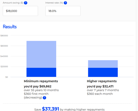 If you only make minimum repayments, that $18,000 could cost you $32,471 or more over time – see the table below. And all because you didn’t have a buffer!